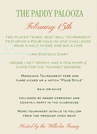 We are pleased to invite you to a special one-day tournament at Mayacama in celebration of Patrick Wilhelm’s 50th birthday. Paddy Palooza promises a spirited day of golf paired with festive flair, thoughtful details, and a lively post-round gathering in the Clubhouse.